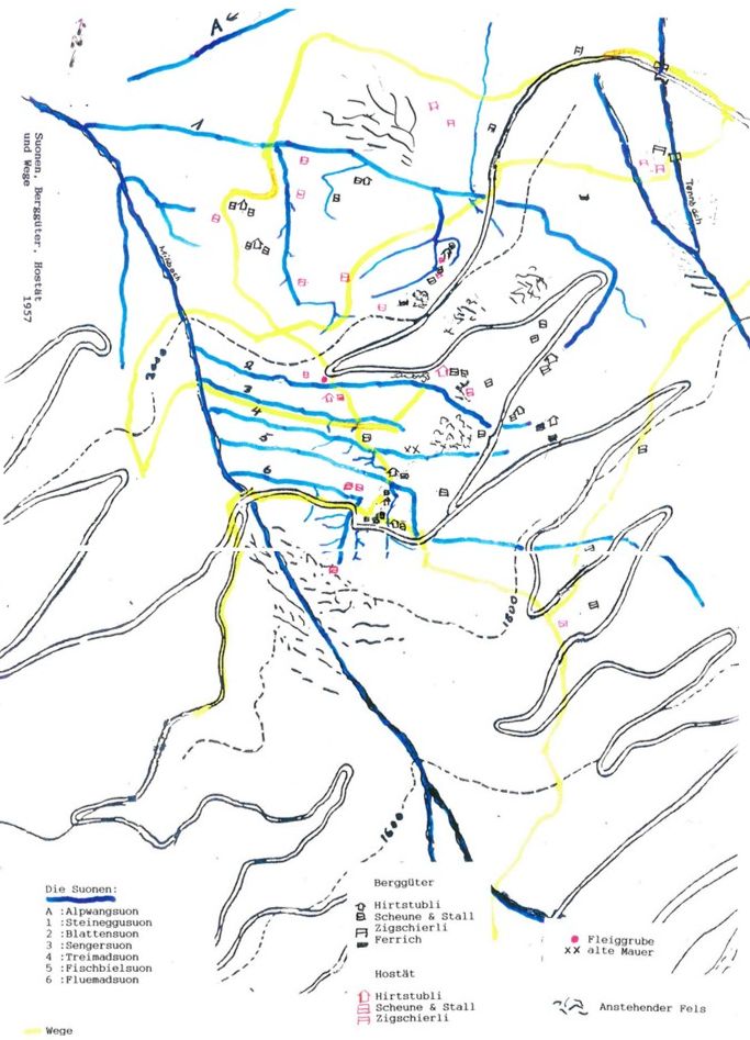 A) Alpwanesuon: diese grosse Suon wurde in der Höhe zwischen Spalihorn und Tennbachhorn gebaut. Sie führte hinab in den Alpwang und wurde zum Tränken des Viehs der Weritzstaffel genossenschaft benutzt. Das Wasser des MiIibachs war für das Vieh der Lauchernalpgenossenschaft reserviert.